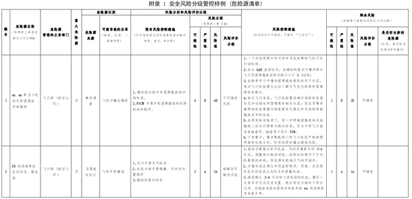 注2:民航風險分級沿用國際民用航空組織分級標準,通常為三個等級,與國家安全生產(chǎn)領域“紅橙黃藍”四個風險等級對應關系為:民航的不可接受風險對應國家安全生產(chǎn)領域的重大風險(紅)和較大風險(橙);民航的緩解后可接受風險對應國家安全生產(chǎn)領域的一般風險(黃);民航的可接受風險對應國家安全生產(chǎn)領域的低風險(藍)。