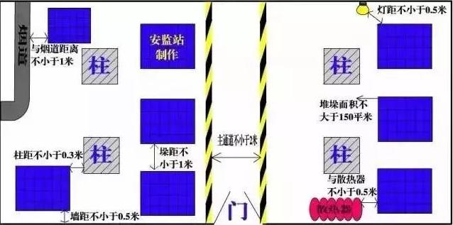 物品堆垛與堆垛之間的距離不小于1米。《倉儲場所消防安全管理通則》(GA1131-2014)6.8