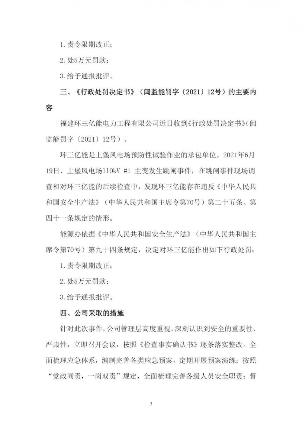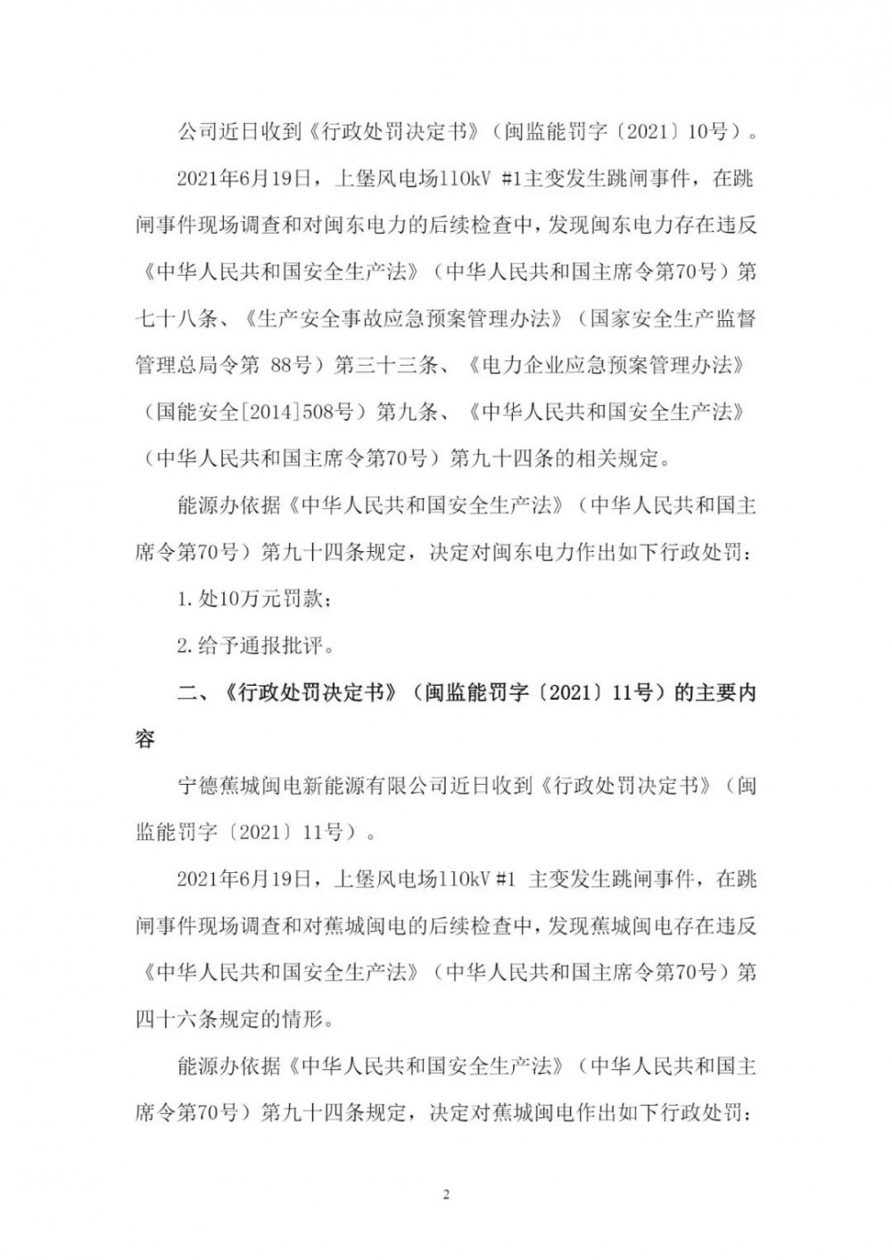 《公告》顯示,2021年6月19日,因上堡風電場110kV#1主變發(fā)生跳閘事件,在跳閘事件現(xiàn)場調(diào)查和對閩東電力的后續(xù)檢查中,發(fā)現(xiàn)閩東電力、蕉城閩電、環(huán)三億能均存在違反相關法律條文的情況,分別處以10萬元、5萬元、5萬元的罰款。