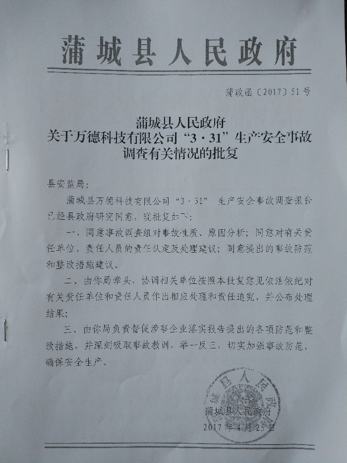 2、對本起事故主體責任單位蒲城萬德科技有限公司,依據(jù)《安全生產法》第一百零九條第一款,建議處以五十萬元的罰款。