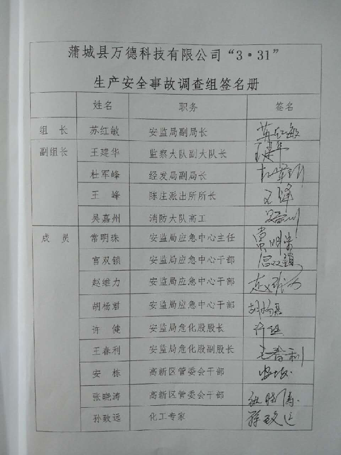 1、王崗,蒲城萬德科技有限公司第三車間班長,對該起事故負有直接責任,鑒于其已在事故中死亡,建議對其免于追究責任。