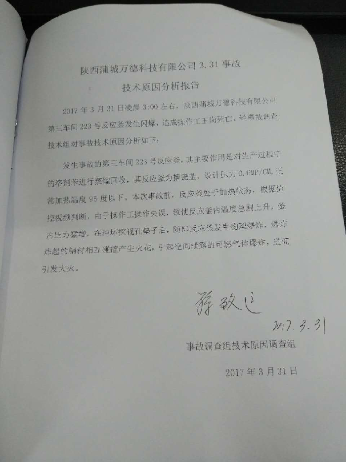 2017年3月31日凌晨3:00左右,蒲城萬德科技有限公司第三車間223反應釜發(fā)生閃爆,引發(fā)第三車間著火,造成一起1名夜班工人死亡。依據(jù)《安全生產法》、《生產安全事故報告和調查處理條例》等法律法規(guī)的規(guī)定,縣政府成立了蒲城萬德科技有限公司“3.31”生產安全事故調查組開展事故調查。并聘請了相關危化專家參與調查。調查組經過現(xiàn)場勘查、調查取證、專家論證和綜合分析,查明了事故發(fā)生的經過、原因、人員傷亡和直接經濟損失等情況,認定了事故的性質和責任,提出了事故防范及整頓措施的建議,現(xiàn)將事故調查報告如下: