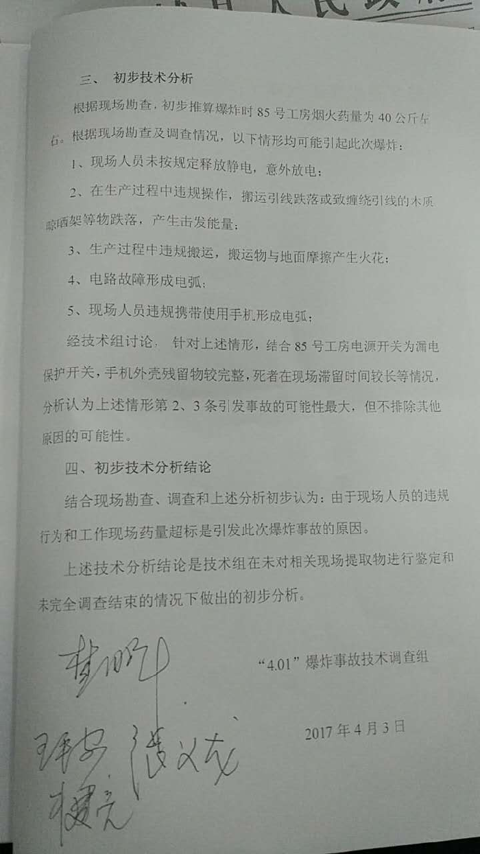蒲城縣光華花炮引線有限公司繞引工人李亞妮未嚴格執行公司上下班制度,下班后仍私自在繞引工房進行繞引作業;繞引工房內超量存放成品引線,違反了《煙花爆竹作業安全技術規程》規定(依據“4.01”事故調查技術組的初步技術分析報告),引發燃燒爆炸。