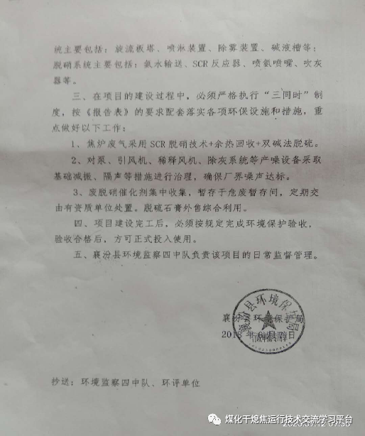 1)濕法脫硫系統(tǒng)由青島博利爾電力環(huán)保設(shè)備有限公司設(shè)計、施工,建設(shè)時間為2015年6月。2)脫硝系統(tǒng)由山西長林能源科技有限公司設(shè)計、施工,建設(shè)時間為2017年5月。3)半干法脫硫系統(tǒng)由北京晨曦環(huán)保有限公司設(shè)計、施工,建設(shè)時間為2018年6月。原襄汾縣環(huán)境保護局2018年6月7日出具了《關(guān)于山西省襄汾縣宏源煤焦化工有限公司一車間、二車間焦化項目焦爐尾氣脫硫、脫硝綜合改造工程建設(shè)項目環(huán)境影響報告表的審批意見》(襄環(huán)審函〔2018〕56號)。4)宏源煤焦化工有限公司一車間、二車間焦化項目焦爐尾氣脫硫、脫硝綜合改造工程工藝簡介:本項目采用的是先脫硝后脫硫工藝,脫硝系統(tǒng)為中低溫SCR脫硝工藝,脫硝效率86%,一爐配一套SCR反應(yīng)器,氨水來自于焦化廠區(qū)內(nèi)氨水管網(wǎng),焦爐煙氣脫硫系統(tǒng)采用雙堿法脫硫工藝,脫硫效率為80%,具體設(shè)備設(shè)施包括:中低溫SCR脫硝裝置、余熱回收裝置、濕電除塵裝置等。