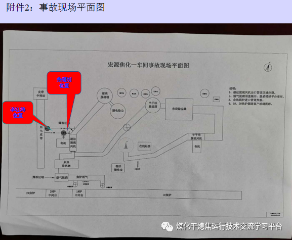 宏源煤焦化工有限公司一車間由于焦爐煙道氣半干法脫硫系統(tǒng)除塵布袋堵塞無法正常運行,于9月1日白班停止半干法脫硫系統(tǒng),啟動濕法脫硫系統(tǒng)運行,處理后的煙道氣由于含水量大,溫度較低不能進入焦爐煙道大煙囪,改由濕法脫硫系統(tǒng)煙囪排放。9月8日8時54分左右引風(fēng)機停車,由于焦爐煙道氣脫硫脫硝控制室人員董副紅在現(xiàn)場巡檢,造成控制室無人值守,未能及時發(fā)現(xiàn),從而未及時采取應(yīng)急處置措施,也未通知焦爐主控室人員采取應(yīng)急處置措施,而焦爐9時仍正常進行交換,交換完成時間大約為47秒,交換作業(yè)完畢后焦爐主控室人員發(fā)現(xiàn)煙道吸力降至20Pa左右,隨即采取了停止加熱措施;9時04分左右在工段長張耀剛指揮下董副紅重新啟動引風(fēng)機,9時06分左右發(fā)生爆炸, 9時22分左右焦爐煙道氣脫硝系統(tǒng)發(fā)生爆炸。