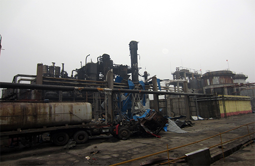 | 8月25日 | 18:46:22 | 氧化塔爆炸,并相繼引燃了氧化塔周邊氫化塔、萃取塔等設(shè)備中的物料。爆炸導致在四層平臺取樣的張某、一層北側(cè)檢查的秦某和程某當場死亡;并導致雙氧水車間南300米的氯堿車間氯氣管道受損,造成少量氯氣泄漏;爆炸碎片和泄露的氯氣導致雙氧水車間辦公室朱康康,中控室鄭某、金某、秦某,氯堿車間荊某、秦某和水泵房張某等7人受傷。 |